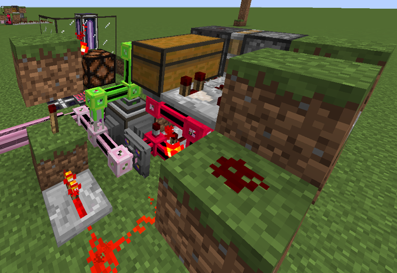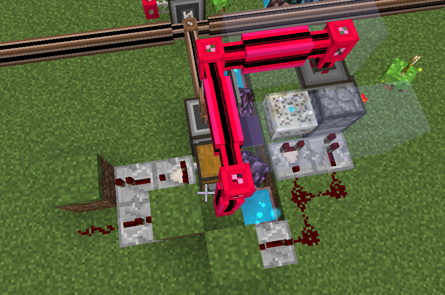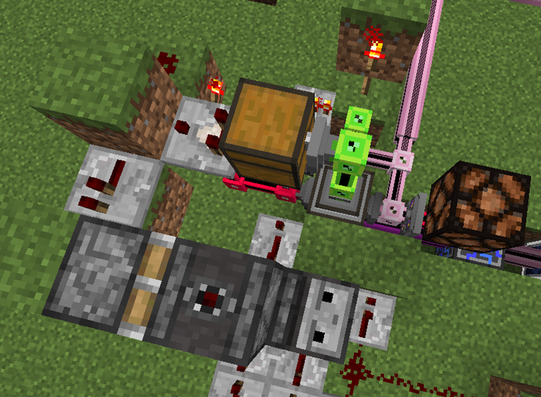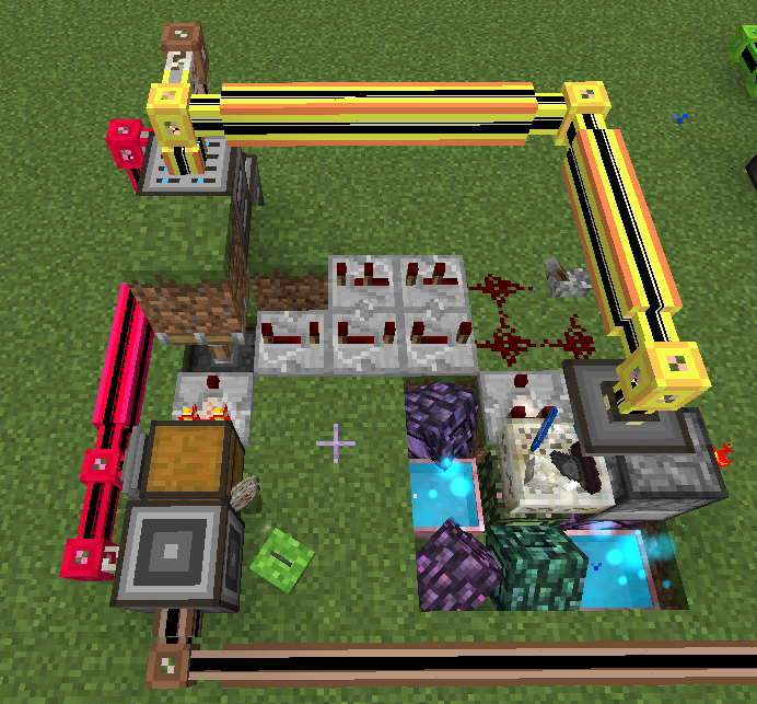 这套流程的问题在于,ME输入输出总线在红石激活下的行为难以理解(奇怪的代码),对这部分的深刻解释需要看代码的具体实现。当然,很少出问题。右下角的小土包底下是粘性活塞,用来发出1tick信号。
