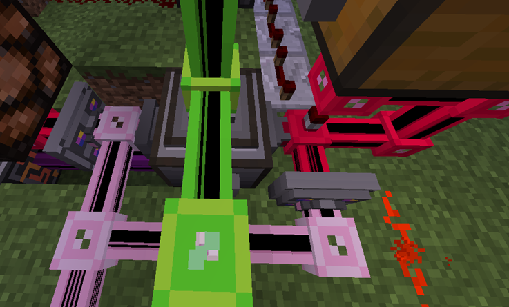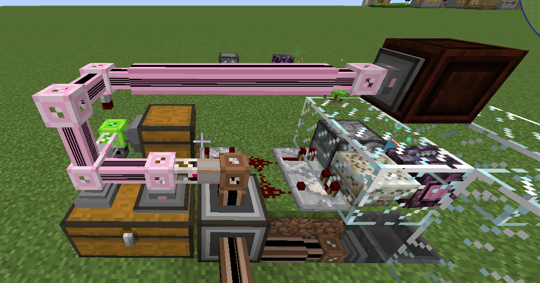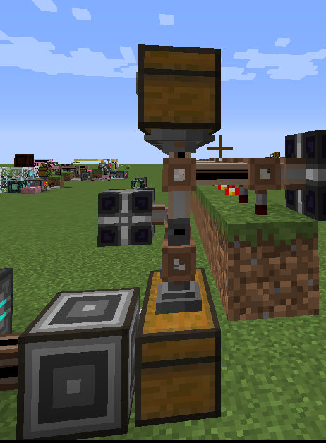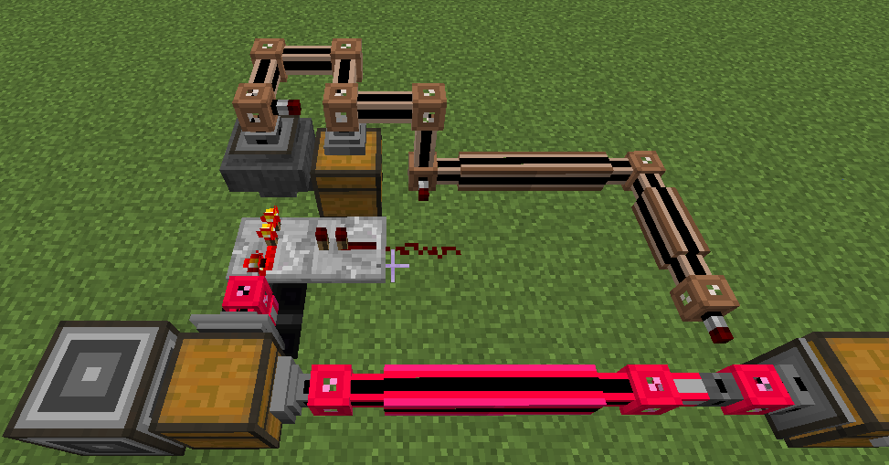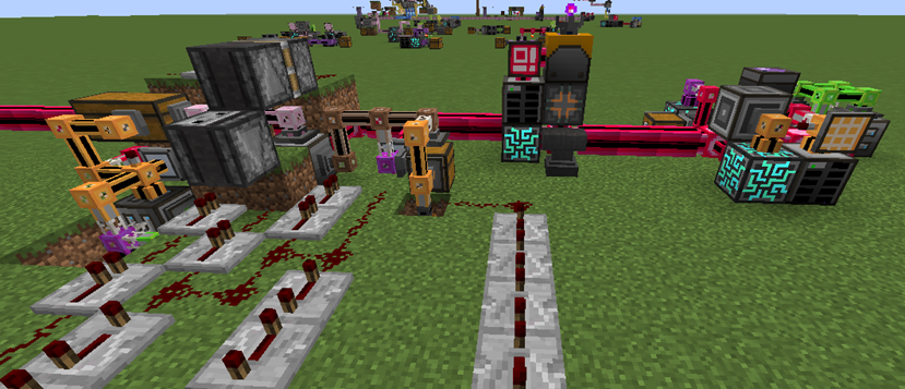 采用的是图3.1.2 红石控制的设计思路,产物沿着ME接口-箱子-ME管道(粉)-花格箱的顺序传输发配。后面箱子中有「标记物」,当下面箱子内容物超过2个时,将「标记物」传输进下面箱子,当合成完成时,将下面箱子的「标记物」传输到后面箱子。依此完成循环。