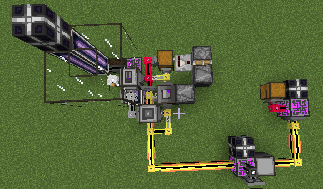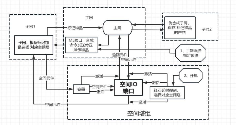 其实,在设计的时候,忽略了一个重要的东西。每一个传送机在设计时都只设计了一个空间IO端口,但是实际上传送机可以有不只一个空间IO端口。如果用两个分别处理输入输出,红石控制能减少很多。同时,可以不使用伪合成,配合ME存储总线进行选址,能减少一个伪合成子网,每台传送机只会占用主网频道2个。思路来源(DoremySwee等)