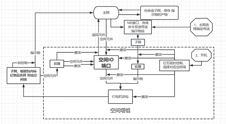 用无线终端,利用伪合成,将“指示物”送进子网。打包机把已使用的空间储存元件和“指示物”打包,送到子网中选择地址,子网将元件送回空间IO端口,将指示物送回主网。